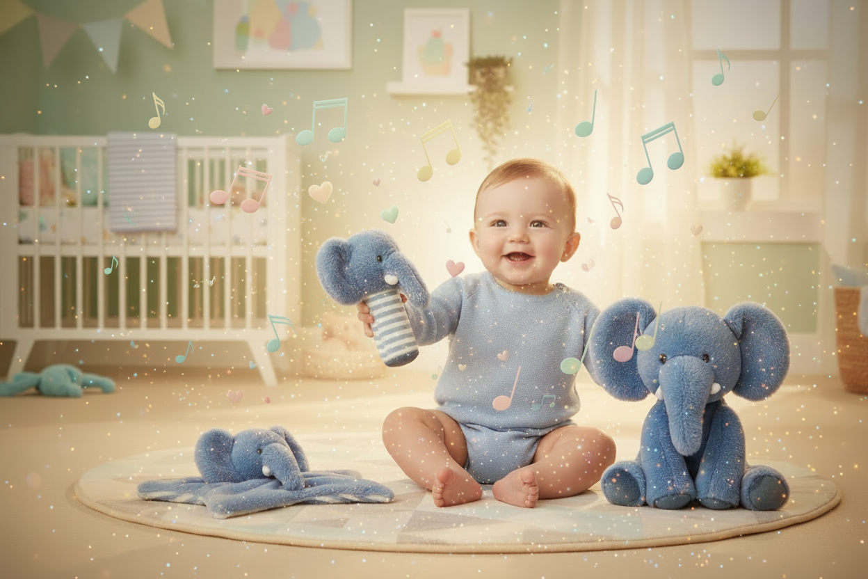Slonić je savršen za igru, maženje i razvoj bebine motorike. Njegova mekana tekstura i nježna zvečkica potiču bebine osjetila i pružaju utjehu.