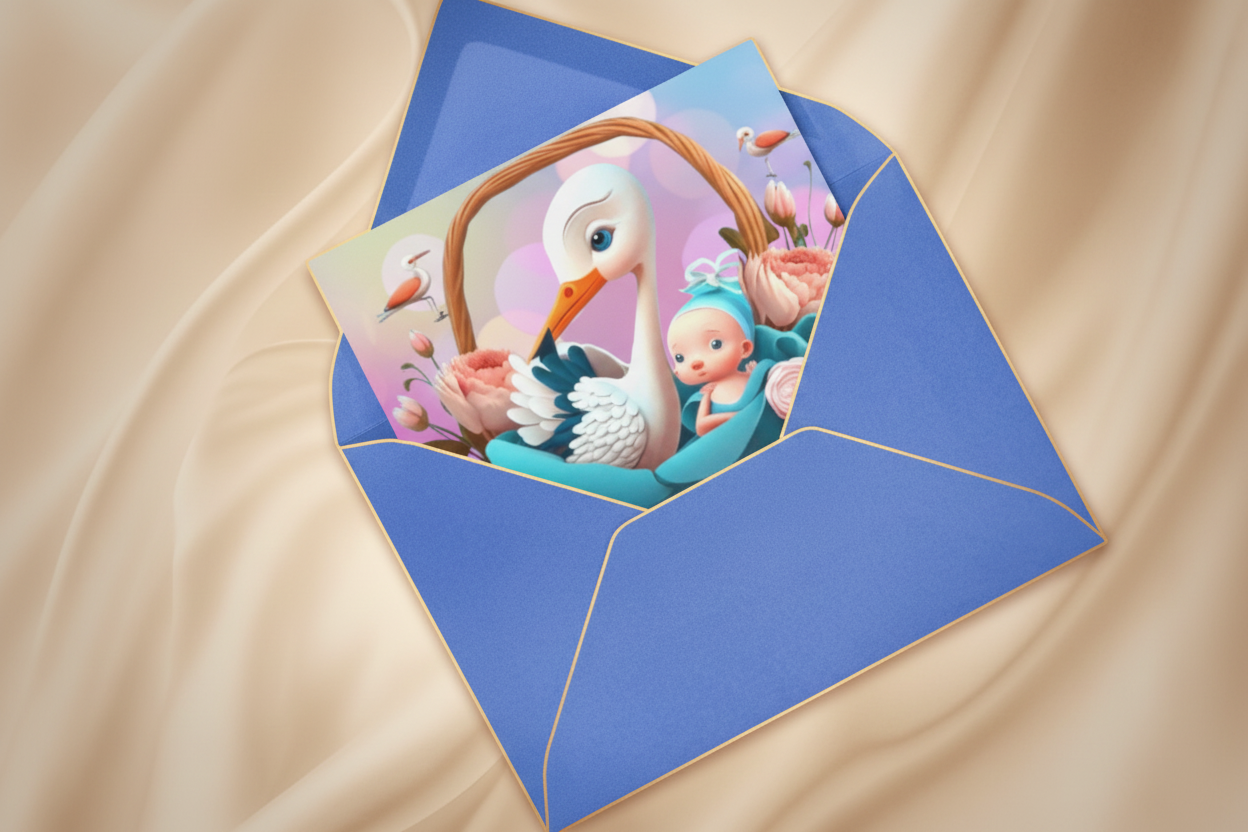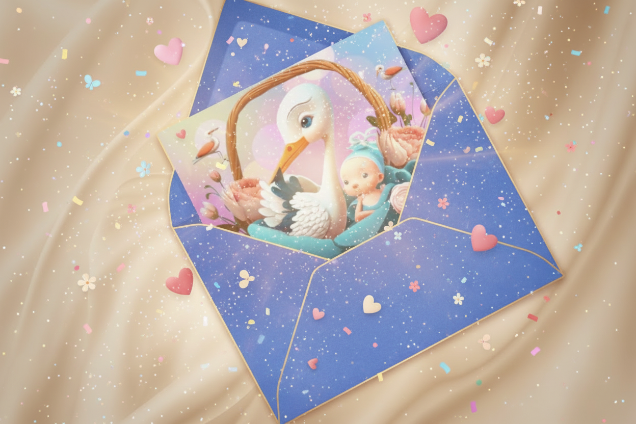 3D RODA I BEBA U CVJETNOJ KOŠARI primjer: Dobro došlo na svijet, biće malo, čisto i meko, a na pogled drago i sretno, život s ovakvim roditeljima prava je bajka, zato mirno rasti i uživaj u svim trenucima što ti ih život pruža.